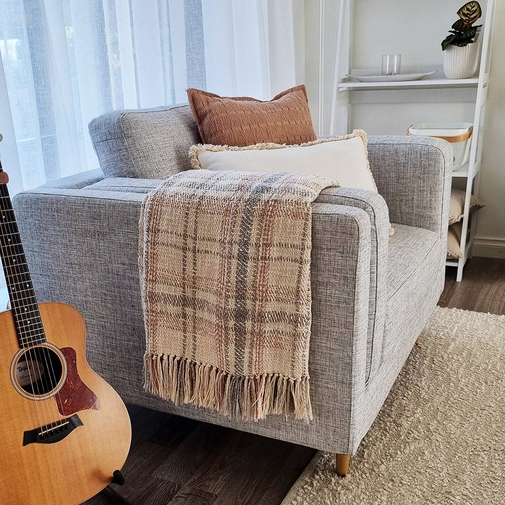 The Rhiannon Throw features a playful check pattern, handwoven from multi-coloured fibers with raw-finish tassels on each side for added texture. Rhiannon is the perfect lightweight, but cosy throw for snuggling up on those cooler summer evenings, or adding a pop of colour to your decor. Available in two colourways.
