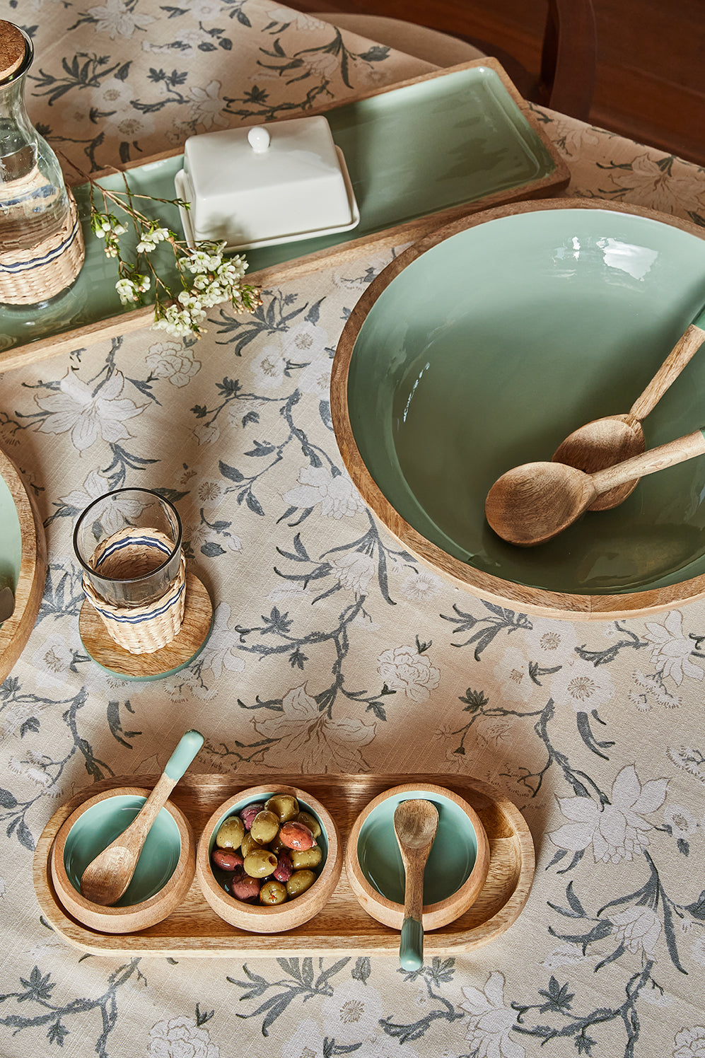 The Corinne Large Rectangular Tray is crafted from premium wood and finished with a modern green enamel inlay, combining natural warmth with modern elegance. Its generous rectangular shape makes it ideal for serving, styling, or display. The contrast between the organic wood grain and chic green interior adds a refined, timeless touch to any space.