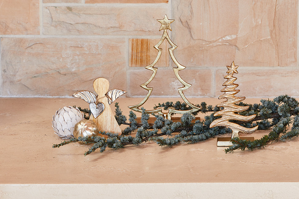 Celebrate winter’s sparkle with the Frosty Xmas Tree on Base in gold. This small, 10x5x18cm tree features frosted detailing and a sturdy base, making it a perfect accent piece to add a touch of shimmer to your mantel, shelves, or holiday vignette.