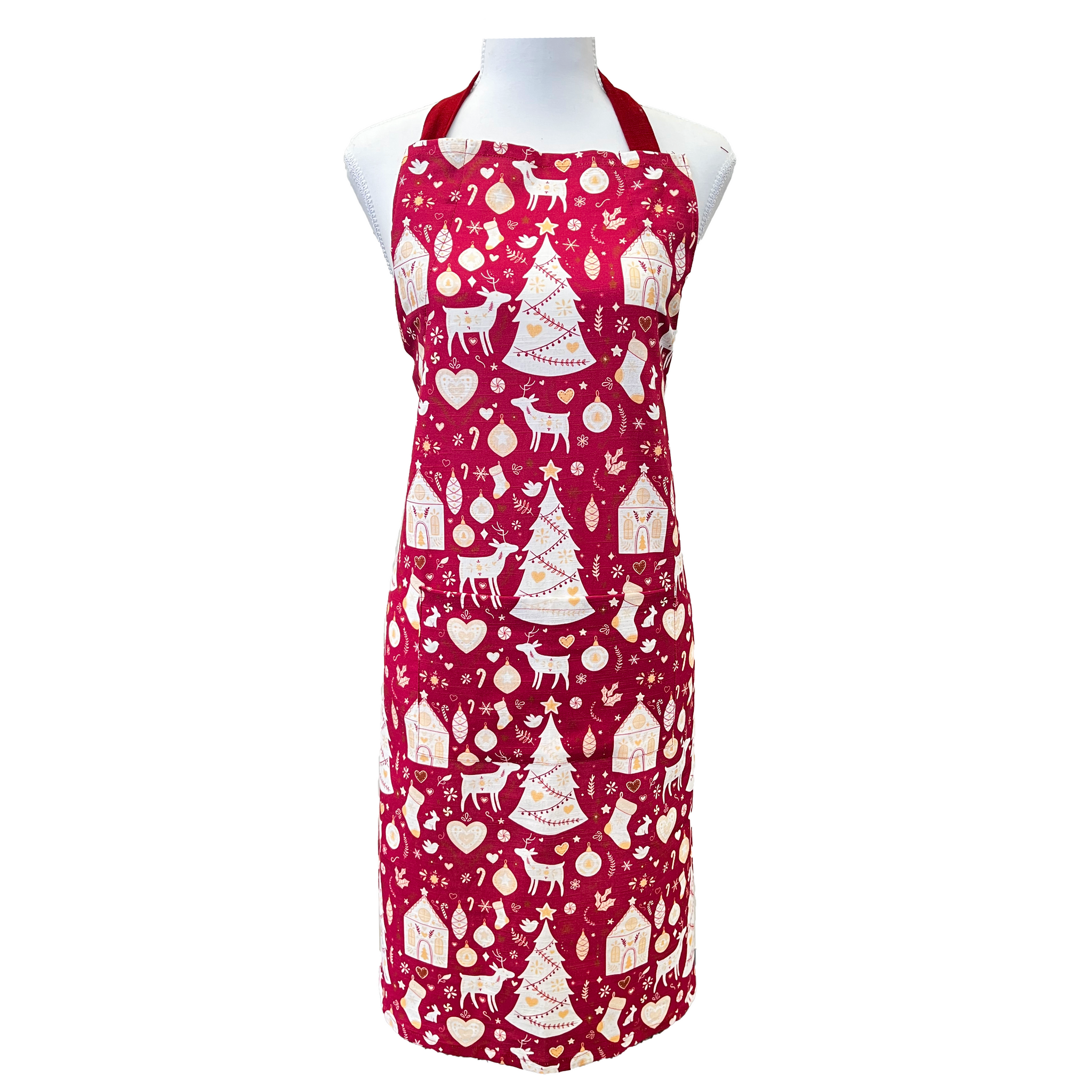Introducing our Scandi Yule Collection, where Nordic charm meets festive functionality. The Scandi Yule Apron blends timeless holiday motifs with everyday practicality. Featuring intricate red and white silhouettes of Scandinavian trees, reindeer, and ornaments, this 100% cotton apron includes an adjustable neck strap and full coverage for festive baking and hosting.